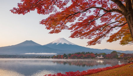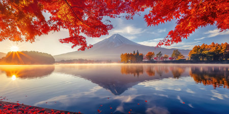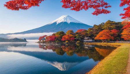 Mountain Fuji rises above lake Kawaguchiko surrounded by autumn foliage and morning fog in Japan. Red leaves reflect on the calm water, creating a serene atmosphere.