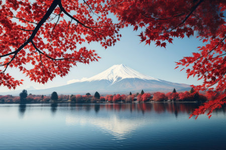 A peaceful autumn scenery at Mount Fuji, Japan with maple leaves around AI generated