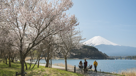 Mt Fuji and cherry blossoms at Kawaguchiko lake, Japan