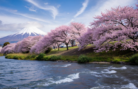 A scenic landscape showcases blooming pink cherry blossoms, a mountain peak with snow, and a river winding through a town. The composition features vibrant colors, natural lighting, and a serene atmosphere. This image is suitable for various commercial uses, including travel promotions and editorial content.