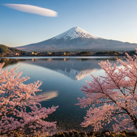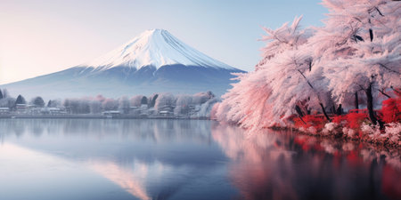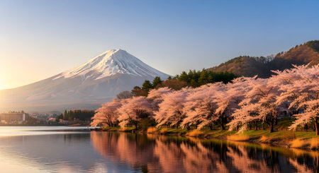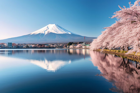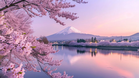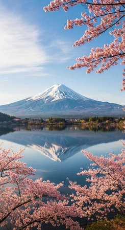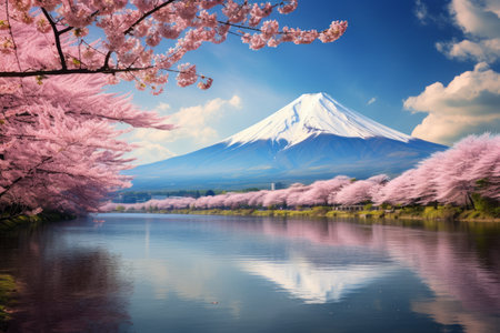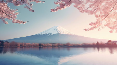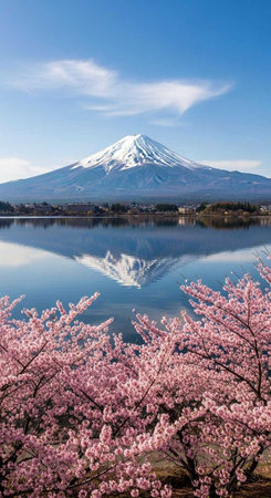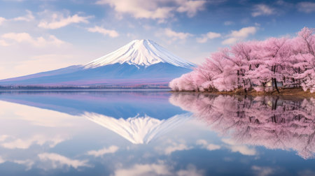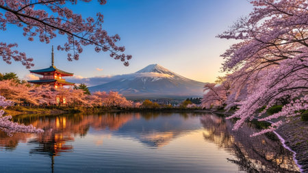 A serene landscape of Mount Fuji with cherry blossoms in bloom reflecting on a calm lake