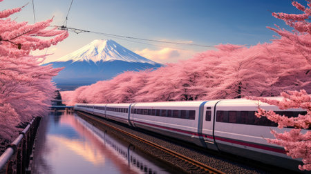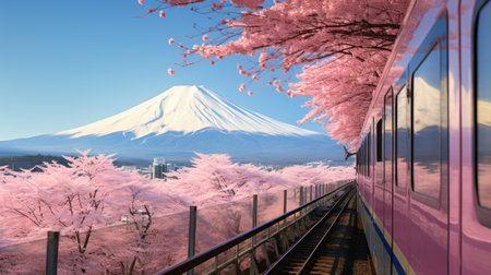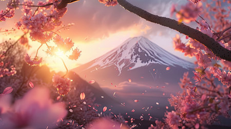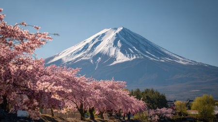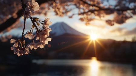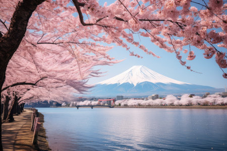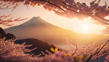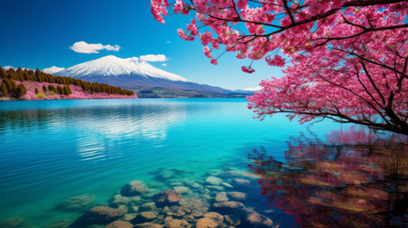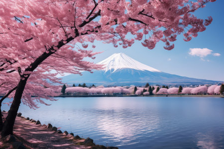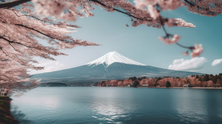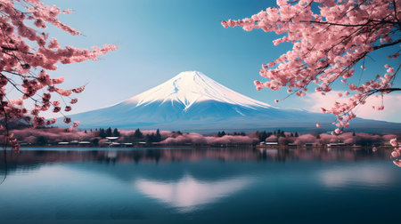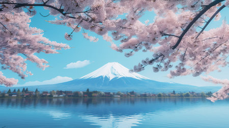 Majestic Mount Fuji in Japan, partially veiled by delicate cherry blossoms in full bloom. Serene lake and tranquil landscape offer a breathtaking springtime view.