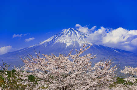 Landscape of mount Fuji with cherry blossom foreground in sprint season at Fujinomiya, Shizuoka prefecture, Japan