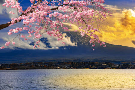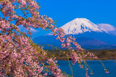 Mount Fuji and cherry blossoms which are viewed from lake Kawaguchiko, Yamanashi, Japan