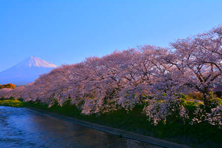 Mount Fuji with Sakura cherry blossom at the river in the morning, Shizuoka, Japan