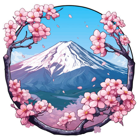 Illustration of Mt. Fuji and cherry blossom frame on white background