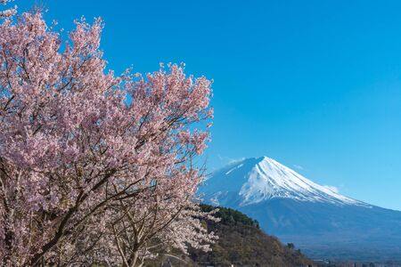 Close-up snow covered Mount Fuji (Mt. Fuji) with blue sky background in pink sakura cherry blossoms springtime sunny day .
