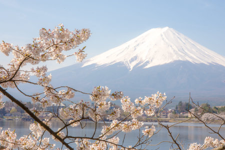 View of mount Fuji (Fujiyama) with Sakura branches at Kawaguchiko, Japan