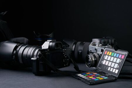Fujifilm X-T4 and Panasonic Lumix S5 are black top cameras from well-known manufacturers. Competition. Dark background. Macro.