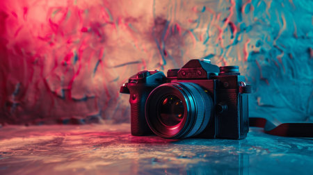 A modern DSLR camera illuminated by colorful artistic lighting creating a vibrant and creative atmosphere.