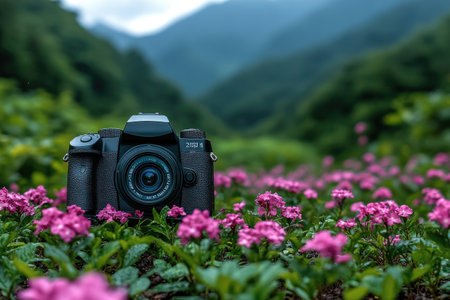 A Black Camera Partially Hidden in a Bed of Pink Flowers