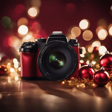 An AI generated illustration of A digital camera with festive Christmas decorations in the background