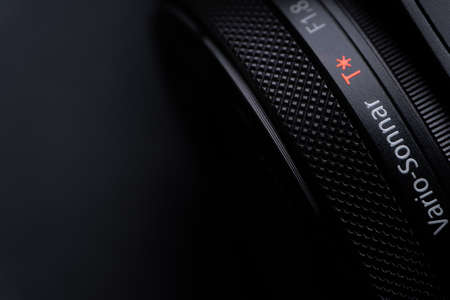 Kuala Lumpur, Malaysia - June 3,2021 : Sony compact or mirrorless camera closeup on black background. Selective focus and crop fragment