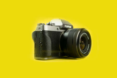 Novokuznetsk,Russia-07.03.2021,Fujifilm X-T100 Entry-Level Mirrorless camera isolated on a yellow background