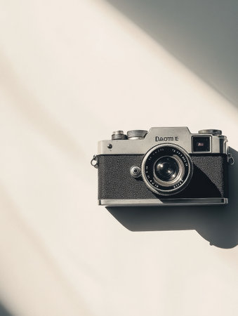 A vintage camera rests on a simple surface, creating dramatic shadows that showcase its elegant details and unique texture.