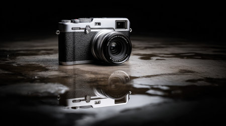 This captivating image showcases a vintage camera resting on a wet surface, reflecting beautifully in low light. The artistic composition highlights the intricate details and design of the camera, creating a moody atmosphere perfect for photography enthusiasts.