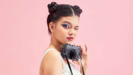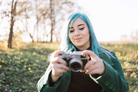 Pretty girl shooting with retro photo camera