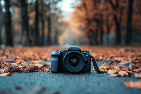 A black camera sits on a path covered in autumn leaves.