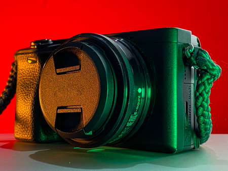 Close-up of a black mirrorless camera with lens cap and green braided strap, set against a vibrant red background with dramatic green lighting