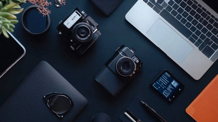 Flat lay of photographer workspace with laptop, camera and accessories on black table