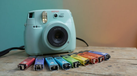 Charming instant camera with colorful film packs displayed on a wooden surface for a creative photography theme