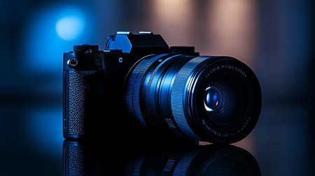 A stylish silver camera on a reflective surface, highlighted by a colorful background. Ideal for showcasing modern photography equipment and artistic concepts.