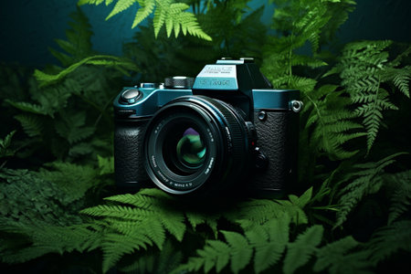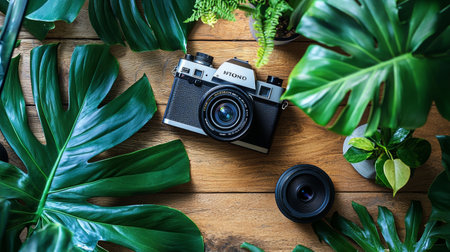 A stylish camera rests on a bed of lush green leaves, creating a stunning contrast against the tropical foliage. This composition evokes a sense of adventure and creativity.