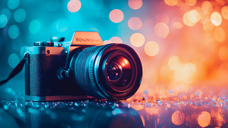 Close-up of a vintage camera with a vibrant blue and orange bokeh background, highlighting the camera lens and textures. Perfect for themes of photography, nostalgia, or vintage style.