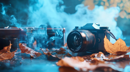 Artistic setup featuring a vintage camera with scattered autumn leaves and atmospheric blue smoke, creating a moody and nostalgic aesthetic.