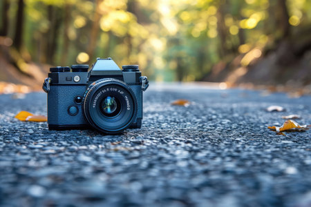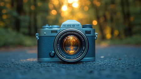 A Vintage Film Camera Resting on a Gravel Path in a Forest