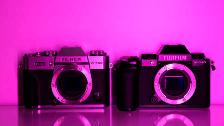 Fujifilm X-S10 body black and Fujifilm X-T30 body silver, in ultraviolet. Neon color, purple color.