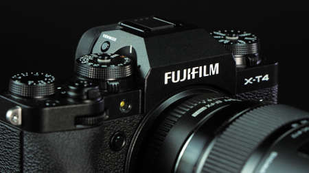 TOMSK, RUSSIA - May 28, 2020: FUJIFILM X-T4 body with Fringer ef-fx proII adapter and sigma 18-35 standing on a black rotate stand, black background