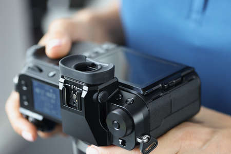 Black professional camera in female hands closeup