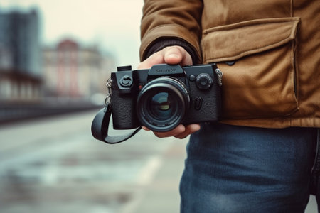 Examining camera before shooting Closeup of man examining his digital camera while standing outdoors : Generative AI