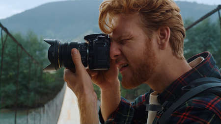 Closeup hipster make picture using camera on river bridge. Red hair millennial take photo at mountains nature hike. Handsome photographer shooting inspiring landscape. Travel blog hobby concept.