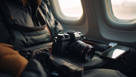 An individuals hand is seen holding a classic black camera over a map, capturing the essence of travel and exploration with a steaming cup of coffee nearby. AI generation