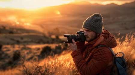 The picture of the professional photographer shooting the picture of nature with the camera and beautiful landscape under the sun light, cameraman require photography knowledge and creative. AIG43.
