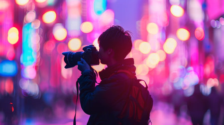 A silhouette of a photographer taking pictures, surrounded by the bokeh of colorful city lights in the vibrant nightlife.