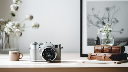 a modern dslr camera, a black-and-white camera, a coffee table with books and a flower, all arranged in a stylish setting of light green and light gray. the leica minilux zoom and fujifilm x-t4, both known for their lifelike renderings and high resolution, are showcased in this image. the composition exudes a sense of sophistication with its light gray and indigo color scheme. ai generated