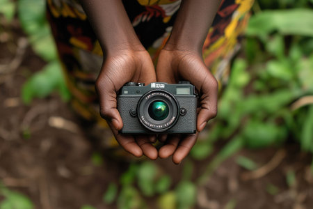 Close-up of hands cradling a camera in a vibrant natural setting. The individual appears ready to capture the beauty of the surroundings, emphasizing a love for photography.
