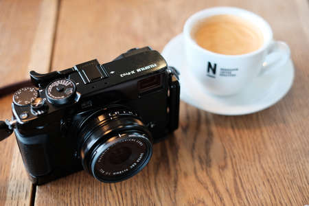 June 25, 2020: Close up view Fujifilm X-T2 DSLR-style weather-resistant mirrorless camera