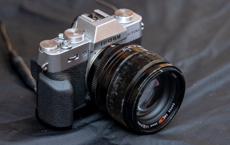 June 25, 2020: Close up view Fujifilm X-T2 DSLR-style weather-resistant mirrorless camera
