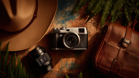 A flat lay composition featuring a vintage camera, leather satchel, fedora hat, and map, evoking a sense of adventure and exploration.