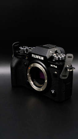 TOMSK, RUSSIA - May 28, 2020: FUJIFILM X-T4 body with Fringer ef-fx proII adapter and sigma 18-35 standing on a black rotate stand, black background