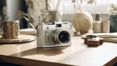 vintage brown leather camera, meticulously detailed, sits on a wooden table, embodying lo-fi aesthetics. the minimalist features, in white and silver, contrast against the light gray and white backdrop, showcasing vintage-inspired designs at, ai generated