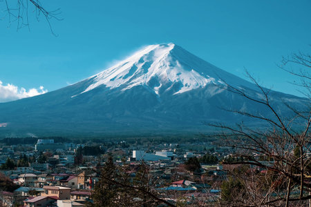 Fujiyoshida, Japan - February 21, 2019: view of mountain Fuji from Fujiyoshida town in sunny day