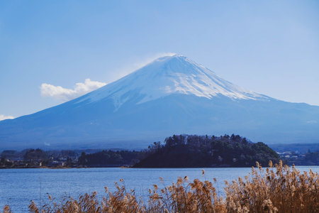 Mount Fuji on a bright winter morning, as seen from across lake Kawaguchi, and the nearby town of Kawaguchiko.