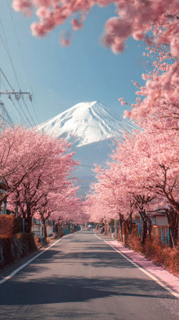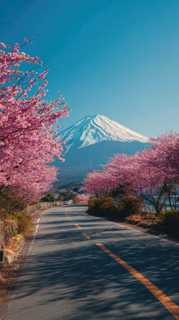 A scenic road leads towards a mountain with a snow-capped peak. Pink cherry blossoms frame the path, creating a vibrant contrast against the mountain and a bright blue sky. The image features natural light and a clear composition suitable for various editorial and commercial applications.