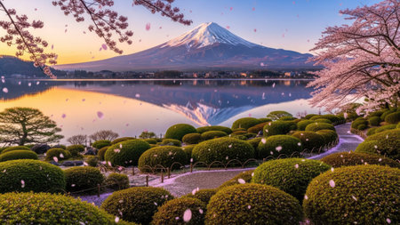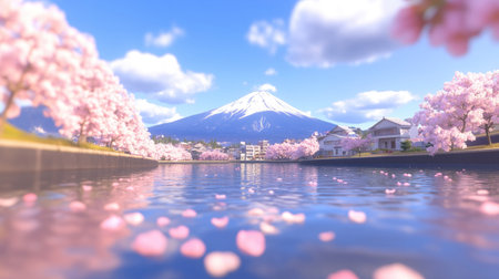 Captured in a 4k, hyper-realistic panorama, cherry blossoms drift across a tranquil Lake Kawaguchiko, with a cloud-draped Mount Fuji dominating the scene --chaos 30 --ar 16:9 --v 6.1 Job ID: 5665127b-fd42-4fb3-8604-dec66aa7a49a