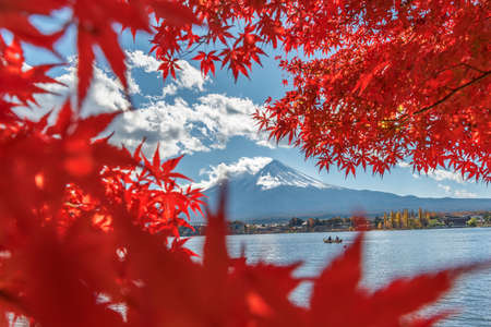 View of Mount Fuji through autumn leaves, Kawaguchiko lake in Japan